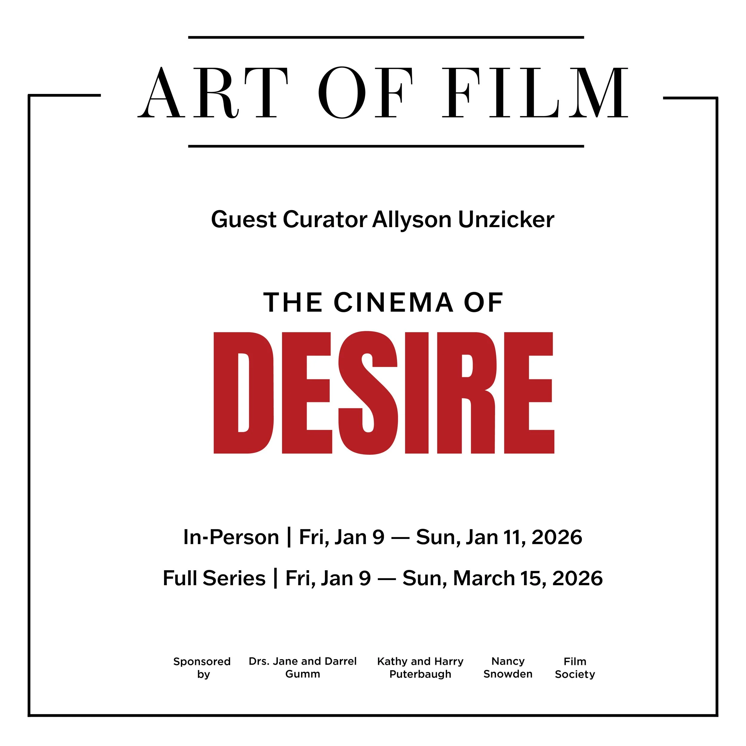 The 2026 Art of Film series opens Friday, January 9, 2026, with Cinema of Desire, a curated cycle of significant American and international films selected by Allyson Unzicker. This inaugural installment explores desire in its many forms—from longing and ambition to intimacy and identity—inviting audiences to experience a wide range of human stories through cinema.